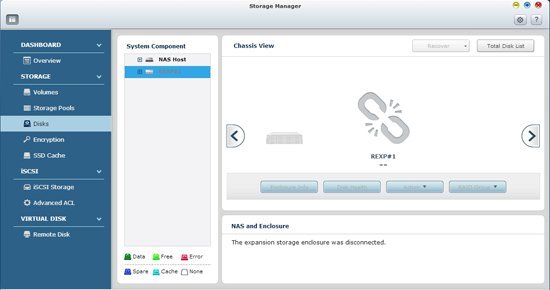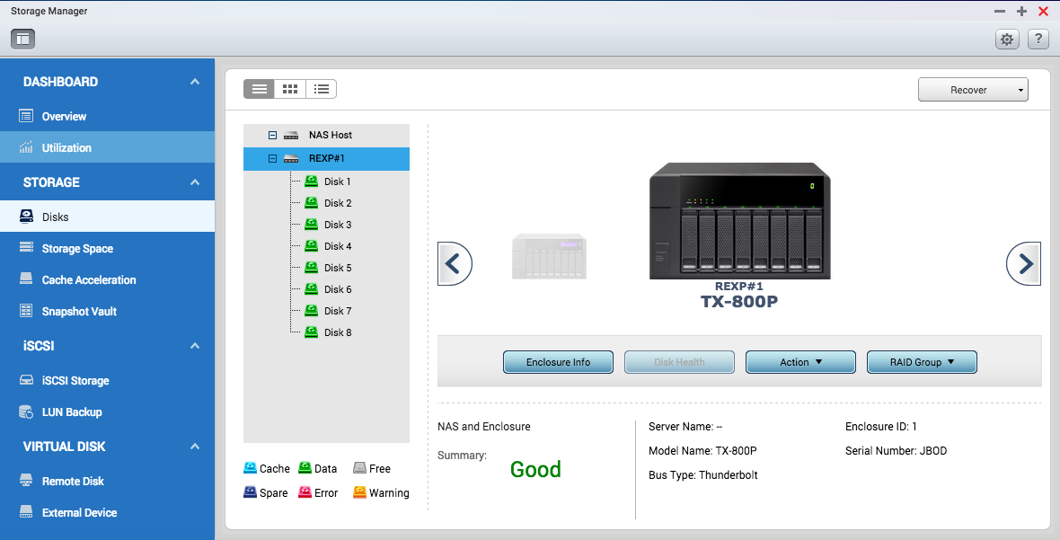 Менеджер хранения QTS предлагает все необходимые инструменты и возможности для управления системой хранения данных в виде удобного и понятного графического интерфейса пользователя, что значительно упрощает процесс расширения дисковой емкости сетевого накопителя и управления модулем TX-800P. Независимо от уровня подготовки, пользователь может легко контролировать состояние TX-800P и установленных в него дисков. В случае подключения сразу нескольких модулей расширения можно без труда идентифицировать каждый из них и соответствующие диски.