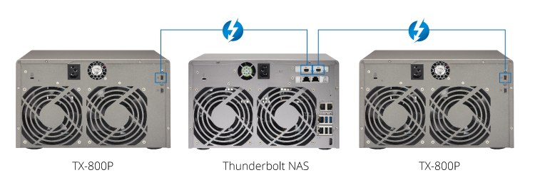 Установка нескольких дополнительных серверов для расширения дискового пространства хранилища может усложнить управление сетевой инфраструктурой и потребовать значительных затрат. Модуль расширения TX-800P является альтернативой решения этой задачи с быстрой интеграцией в существующую инфраструктуру и позволяет увеличить дисковую емкость вашего накопителя QNAP Turbo NAS Thunderbolt.