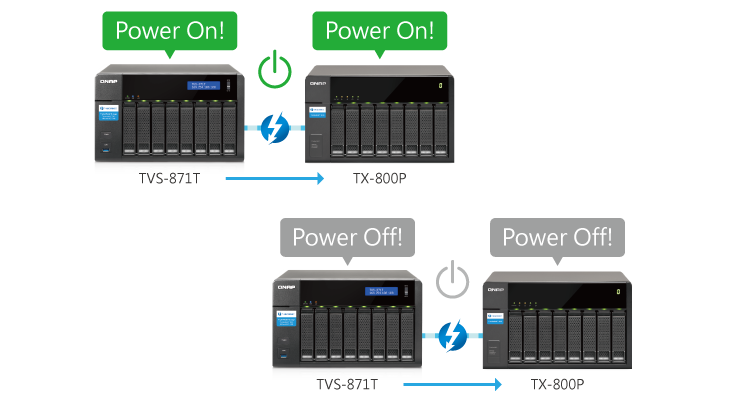 Модуль расширения TX-800P автоматически включается и выключается в зависимости от головного устройства – сетевого хранилища QNAP Turbo NAS, что позволяет экономить электроэнергию и повышает удобство работы.
