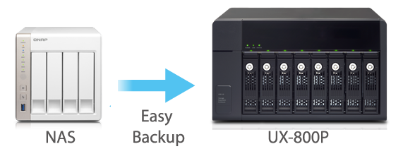 Модуль расширения QNAP UX-800P используется как недорогое и быстрое хранилище, куда можно скидывать резервные копии важных данных с головного устройства Turbo NAS. Администратор настраивает выполнение бэкапов данных в режиме реального времени или по расписанию.
