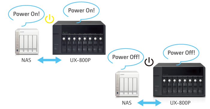 Модуль расширения UX-800P автоматически включается и выключается в зависимости от головного устройства – сетевого хранилища QNAP Turbo NAS, что позволяет экономить электроэнергию и повышает удобство работы.