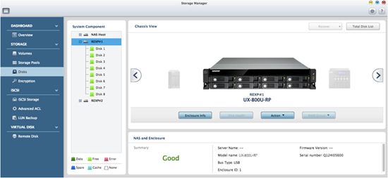 Менеджер хранения QTS предлагает все необходимые инструменты и возможности для управления системой хранения данных в виде удобного и понятного графического интерфейса пользователя, что значительно упрощает процесс расширения дисковой емкости сетевого накопителя и управления модулем UX-800U-RP. Независимо от уровня подготовки, пользователь может легко контролировать состояние UX-800U-RP и установленных в него дисков. В случае подключения сразу нескольких модулей расширения можно без труда идентифицировать каждый из них и соответствующие диски.